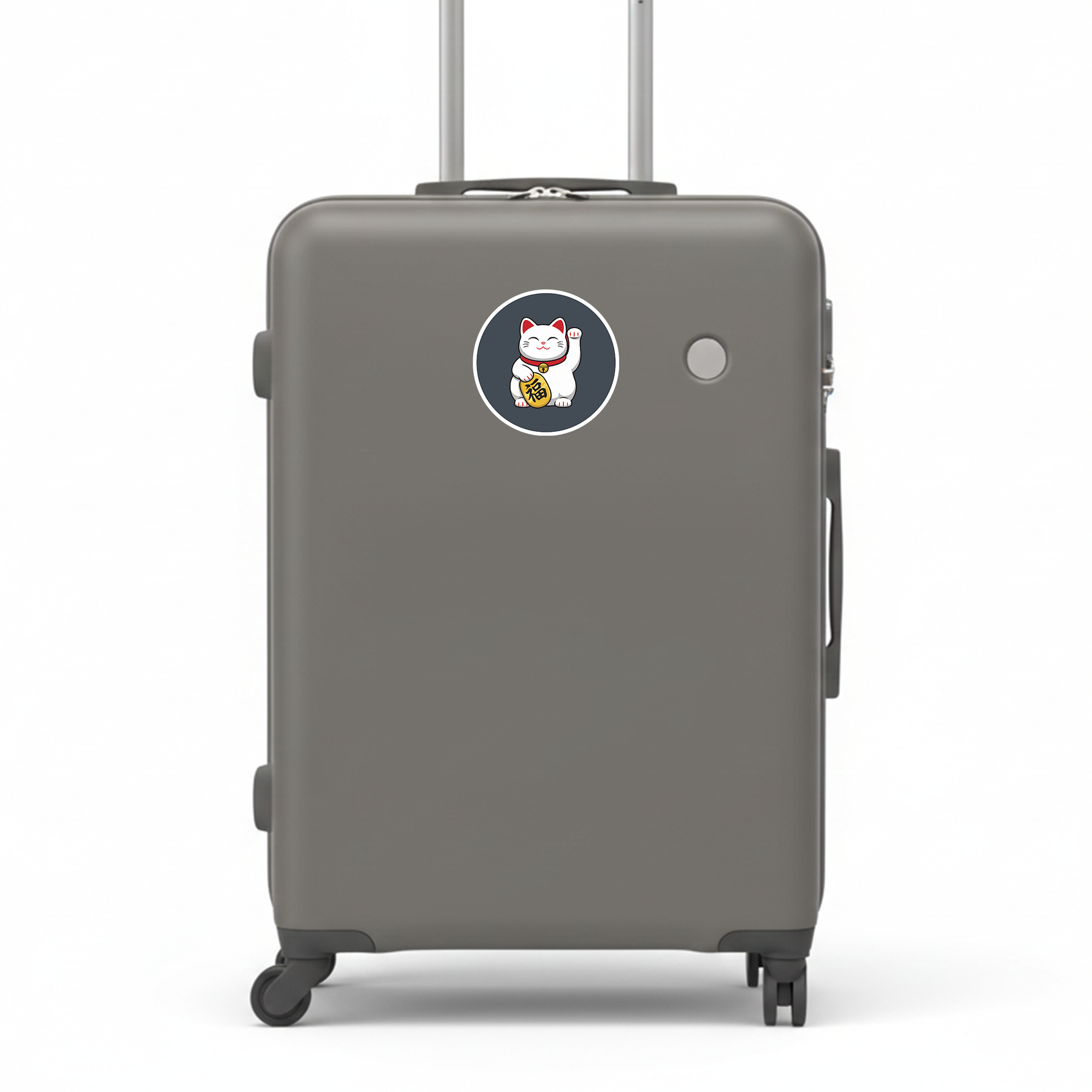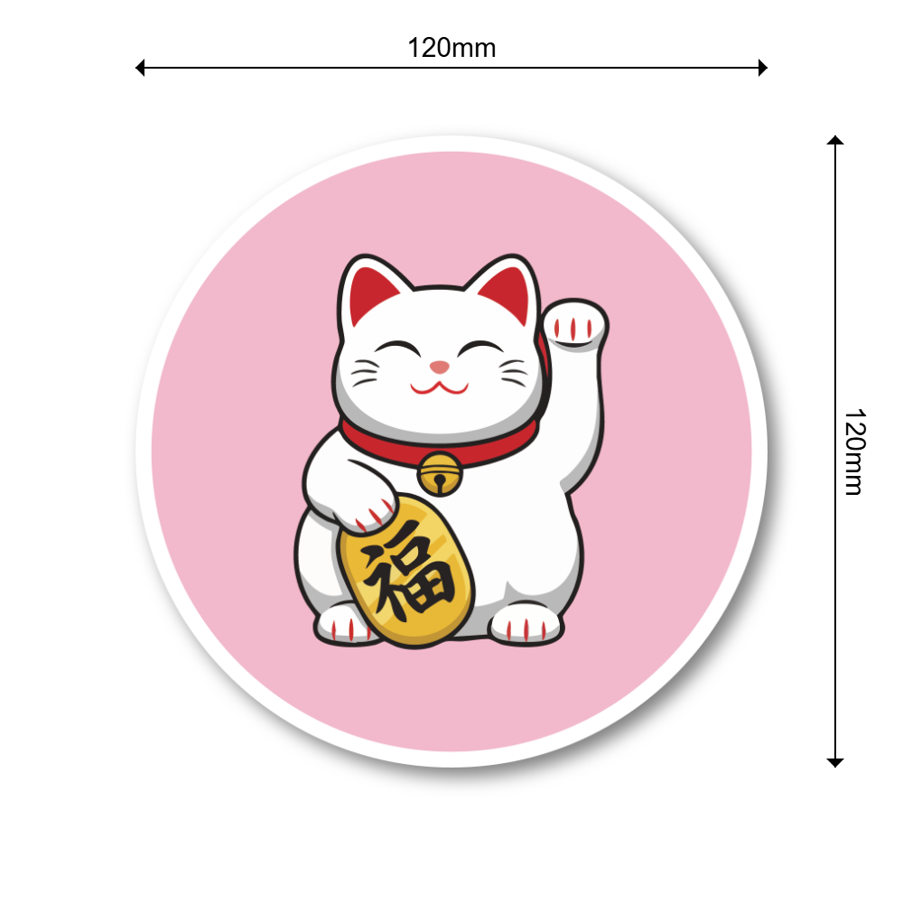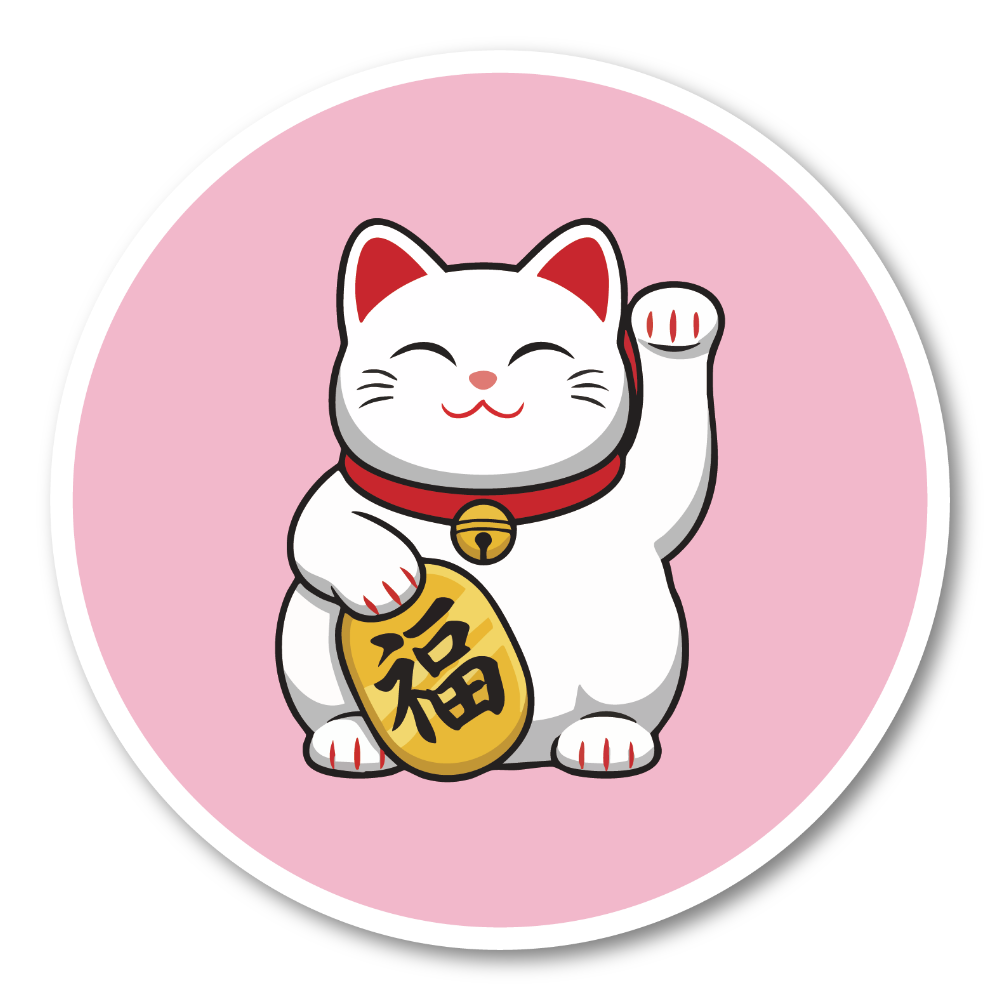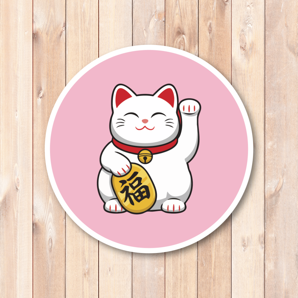 福を呼び込む日本の招き猫デザイン:にっこり微笑む招き猫を大きく描いた丸型ステッカーです。片手を上げた定番ポーズと、ころんとしたシルエット、コインの「福」の文字で、見るたびにハッピーな気分を運んでくれます。日本らしい縁起物モチーフなので、和テイストが好きな方はもちろん、ビジネス繁盛や開運のお守り代わりにもぴったり。ご自分用はもちろん、海外の方へのちょっとしたギフトやお土産にも使いやすいデザインです。