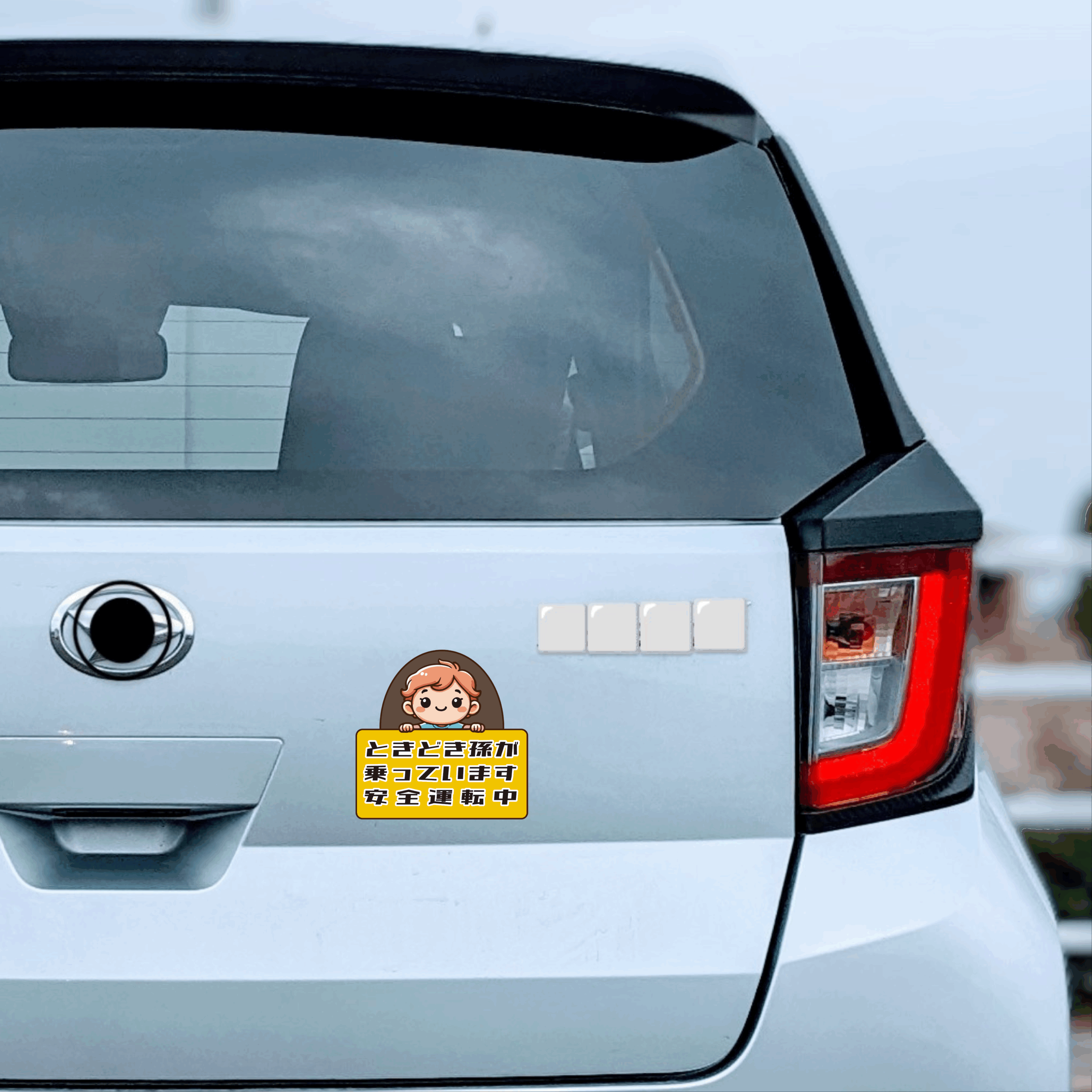 デザインと耐久性:「ときどき孫が乗っています」ステッカーは、男の子・女の子から選べる可愛いイラストで、孫が同乗していることをやさしく周知します。屋外向けの高品質ビニール素材を採用し、雨風や紫外線に強く色あせしにくい仕様。気泡が入りにくい粘着剤でスムーズに貼れ、はがした後も跡が残りにくいので、愛車の美観を保ったまま安心して使えます。