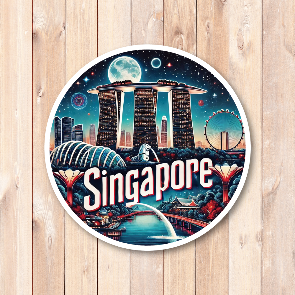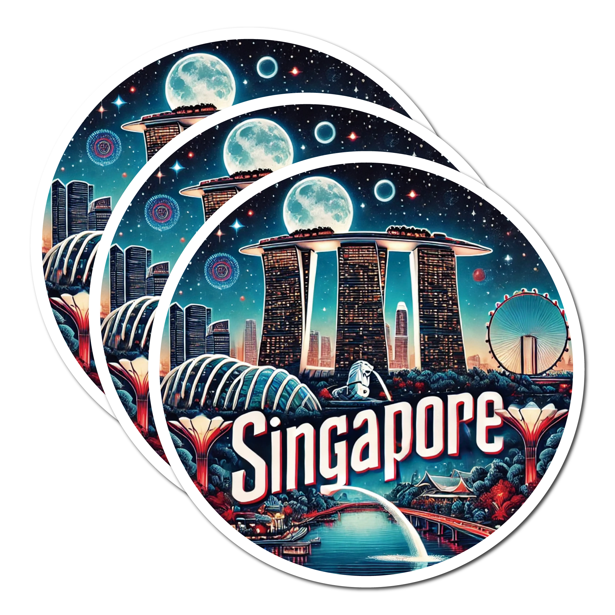 アジアの夜景ステッカー 3枚セット(76.2mm) 香港・ソウル・シンガポール – トラベル・シティ風景デザイン 防水デカール – シンガポール