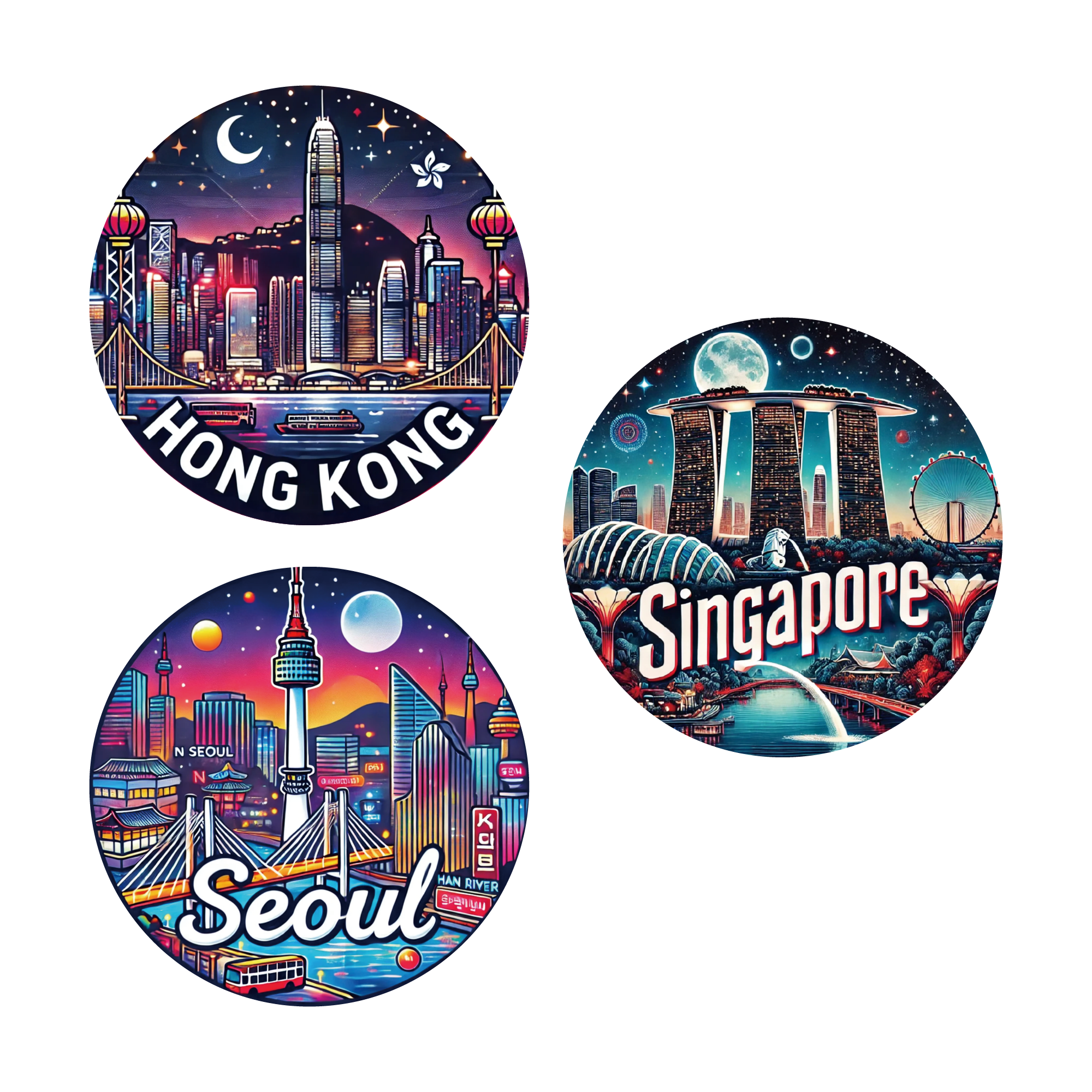 アジアの夜景ステッカー 3種セット(76.2mm) 香港・ソウル・シンガポール – トラベル・シティ風景デザイン 防水デカール – 3種セット