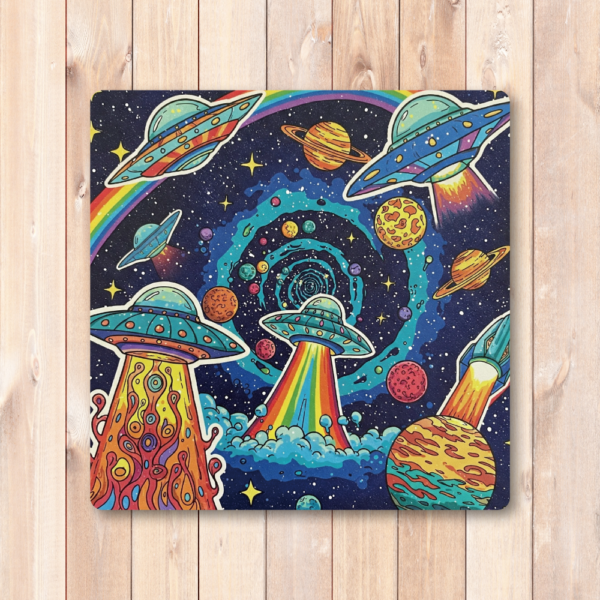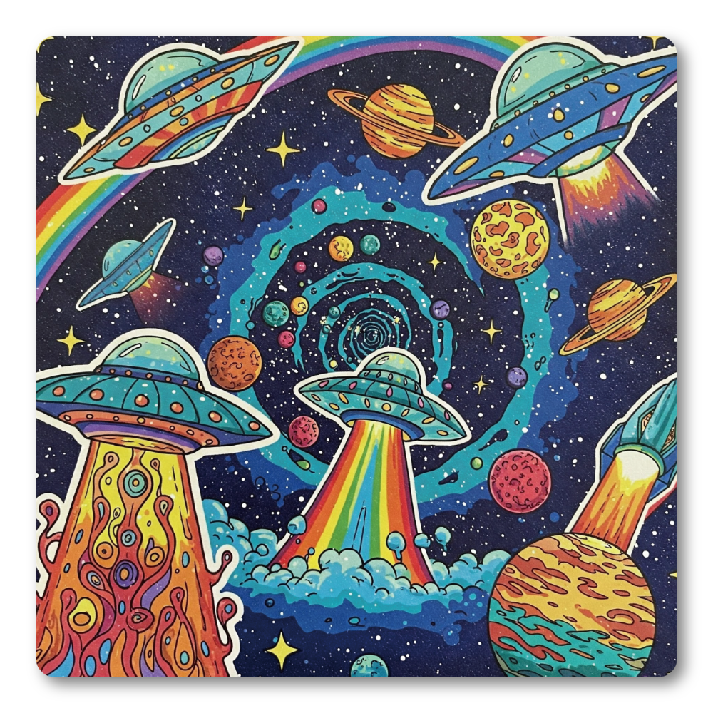 選べるバリエーションであなたの宇宙をカスタム!:全6種類のバリエーションは、それぞれ異なる宇宙の世界観を表現。にっこり笑った惑星たち、瞳がたくさんある不思議な宇宙生物、ワープするUFOに神秘的な星座模様まで…。どれも1枚ずつでも楽しめるクオリティで、まとめて揃えたくなること間違いなし。サイケなカラーとコズミックな世界観が好きな方、個性派ステッカーをお探しの方にぴったりです!