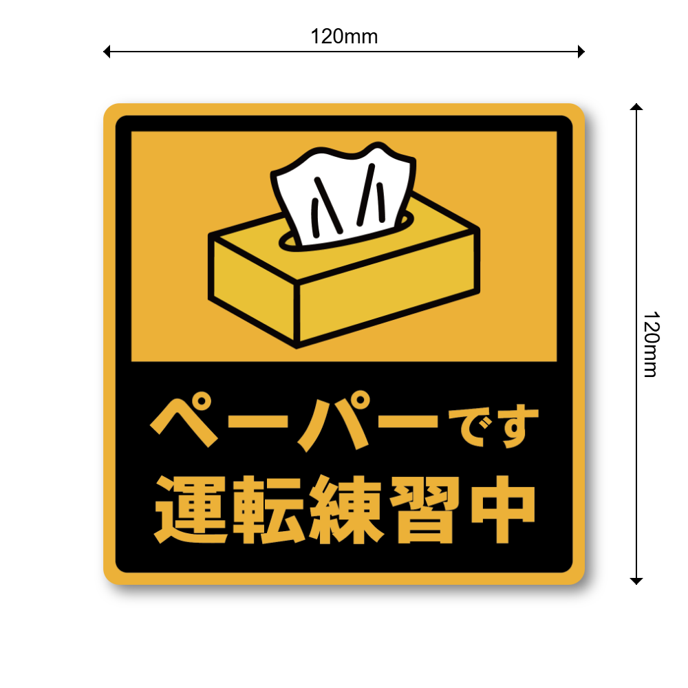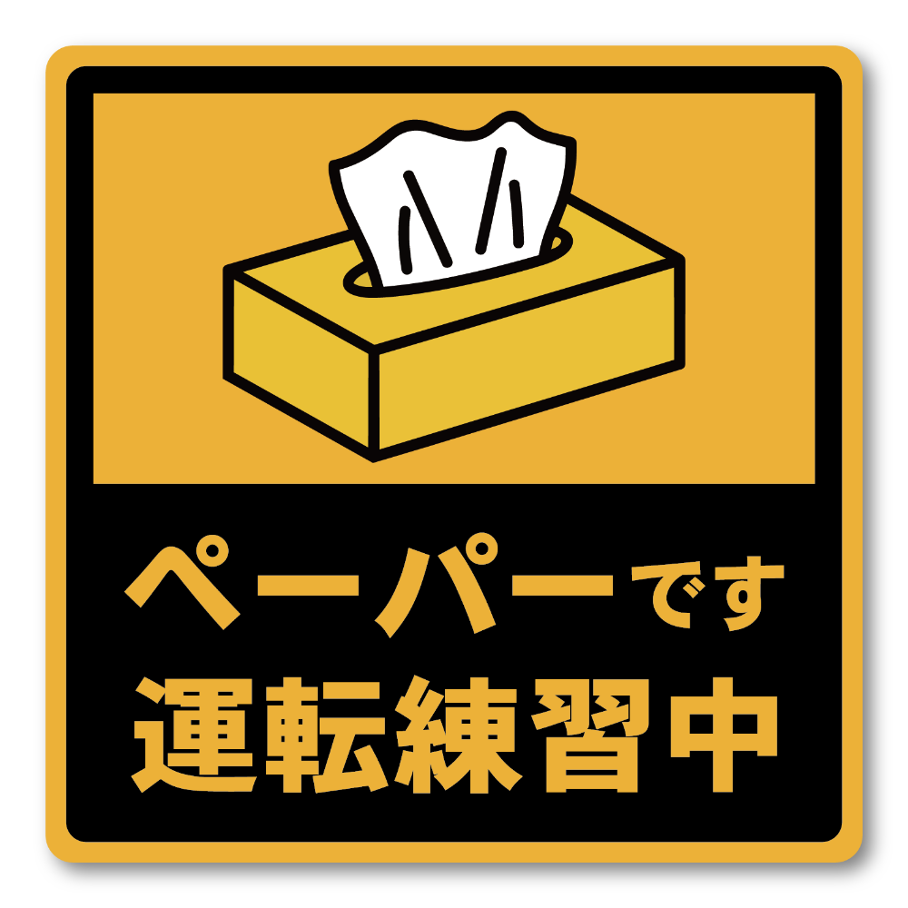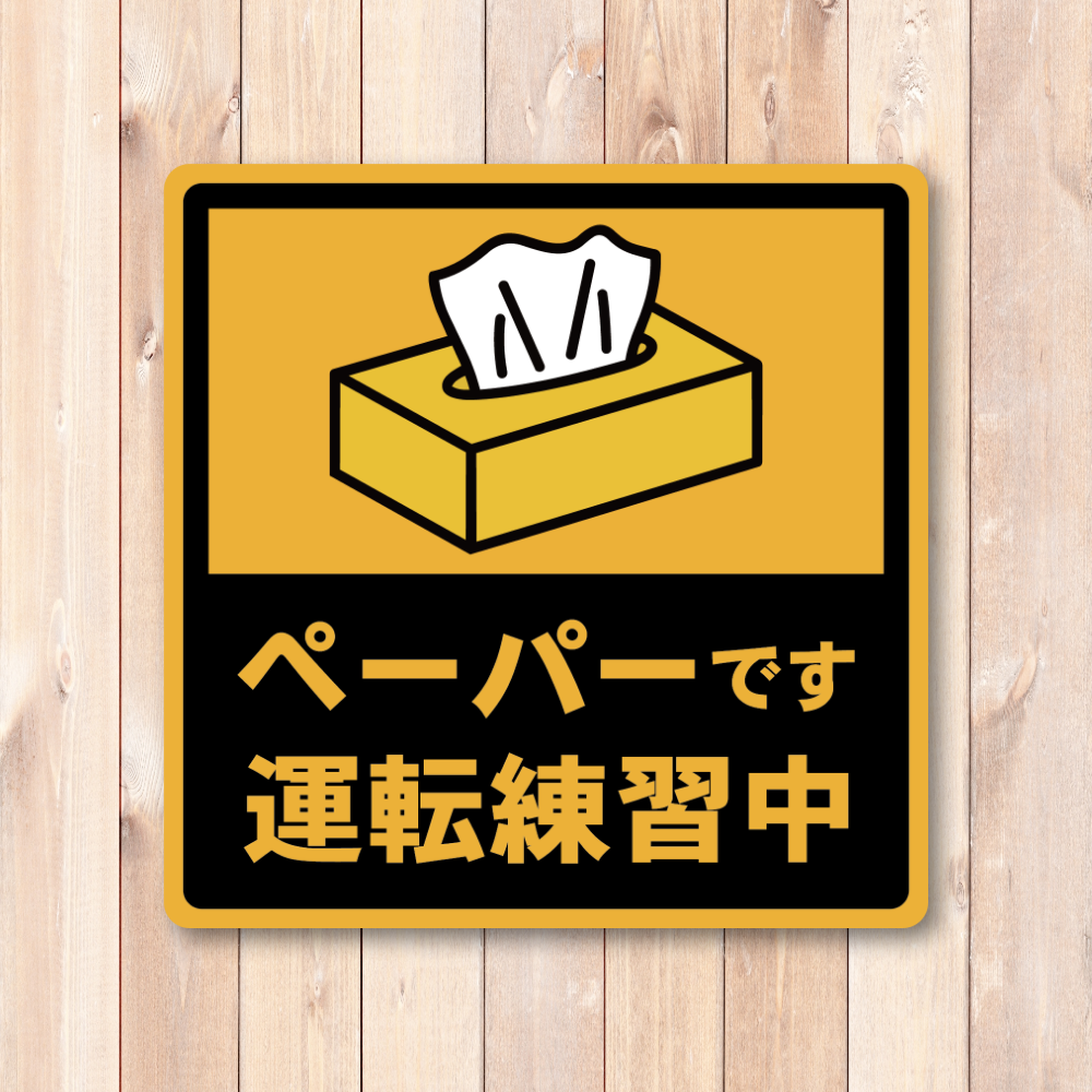 ペーパーです、をユーモアで伝える注意喚起:ティッシュ(ペーパー)モチーフのイラストで「ペーパードライバー」をやわらかく表現した、見やすく伝わりやすい車用ステッカーです。主張しすぎないのに視認性はしっかり。初心者ドライバーの不安を少し軽くしつつ、周囲へ配慮を促せます。デザインは「運転練習中」「車間あけて」の2種類から選べます。