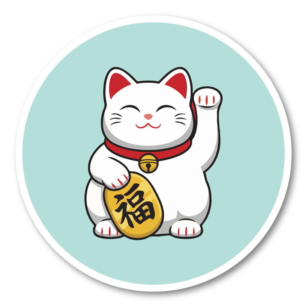 福を呼び込む日本の招き猫デザイン:にっこり微笑む招き猫を大きく描いた丸型ステッカーです。片手を上げた定番ポーズと、ころんとしたシルエット、コインの「福」の文字で、見るたびにハッピーな気分を運んでくれます。日本らしい縁起物モチーフなので、和テイストが好きな方はもちろん、ビジネス繁盛や開運のお守り代わりにもぴったり。ご自分用はもちろん、海外の方へのちょっとしたギフトやお土産にも使いやすいデザインです。