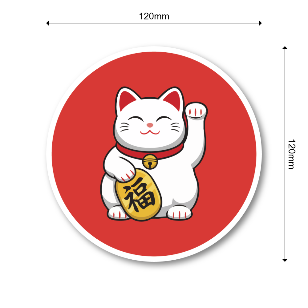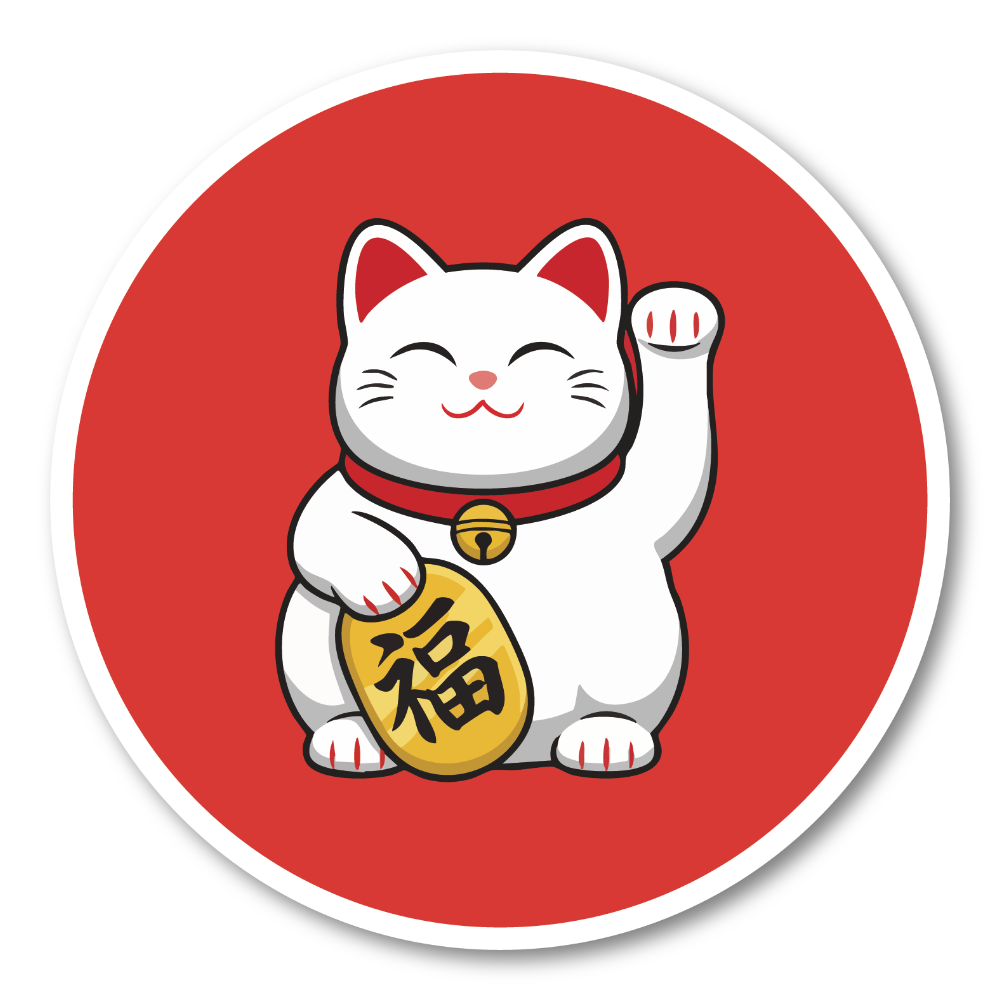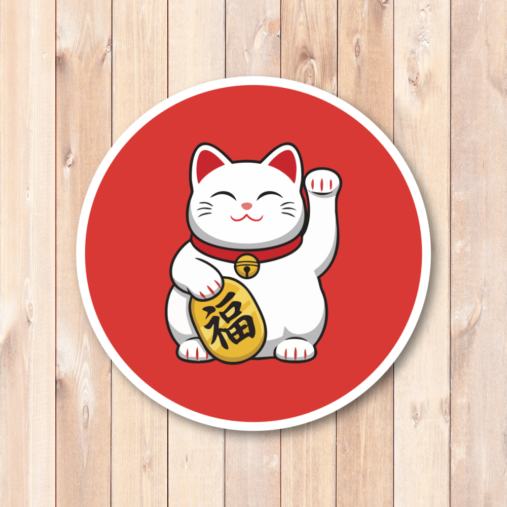 福を呼び込む日本の招き猫デザイン:にっこり微笑む招き猫を大きく描いた丸型ステッカーです。片手を上げた定番ポーズと、ころんとしたシルエット、コインの「福」の文字で、見るたびにハッピーな気分を運んでくれます。日本らしい縁起物モチーフなので、和テイストが好きな方はもちろん、ビジネス繁盛や開運のお守り代わりにもぴったり。ご自分用はもちろん、海外の方へのちょっとしたギフトやお土産にも使いやすいデザインです。