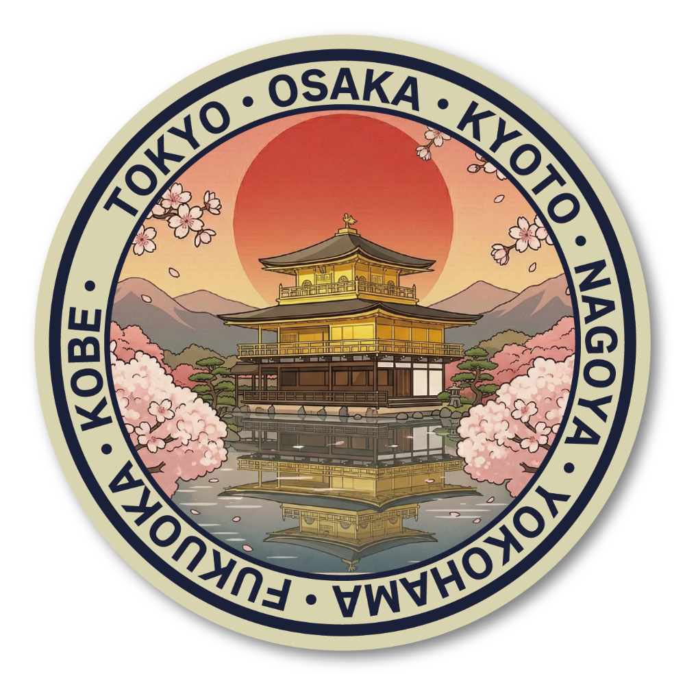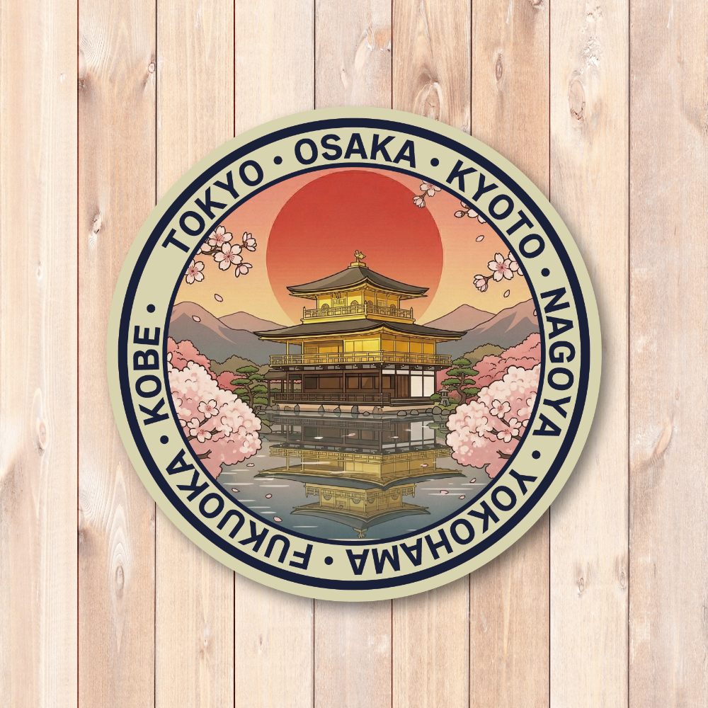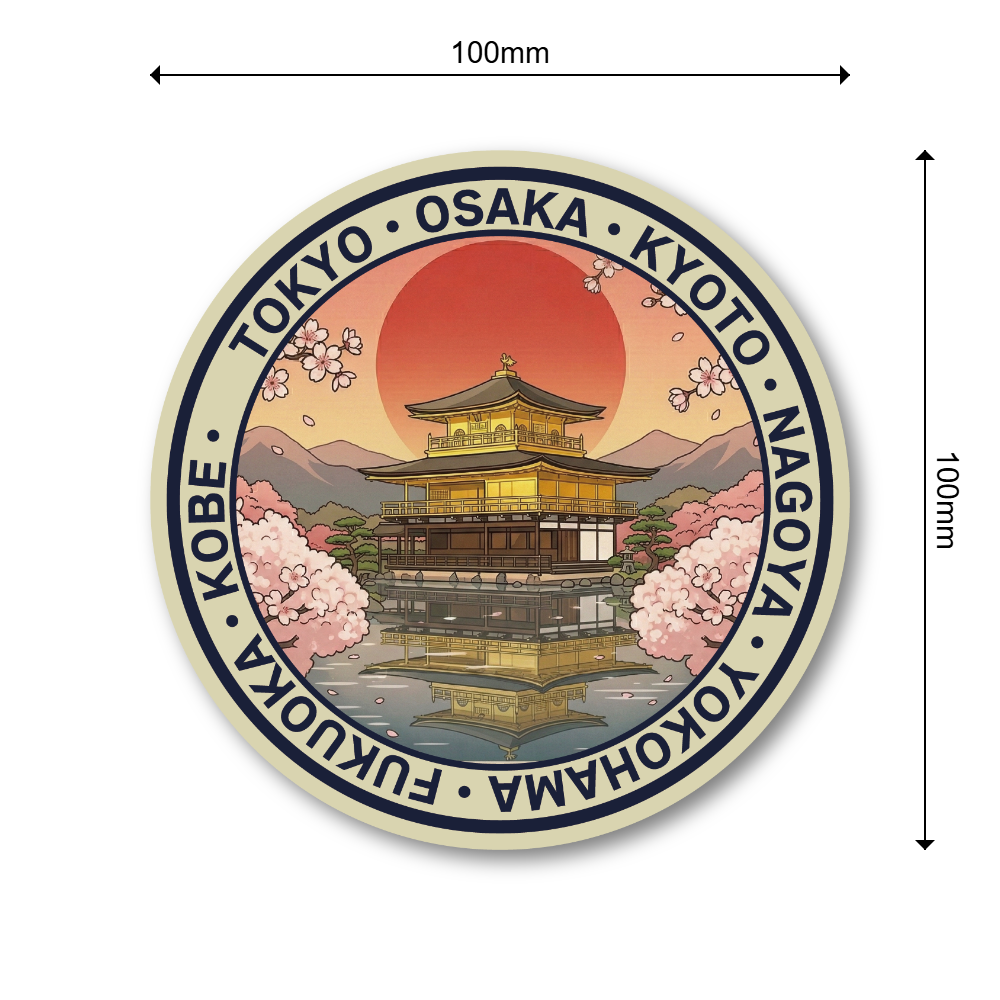 日本トラベルステッカー 円形デザイン 富士山・鳥居・寺院・寿司・招き猫など 日本の風景と文化を描いたコレクション 防水ビニールステッカー スーツケース・タブレット・ボトル用 金閣寺と桜(京都名所)