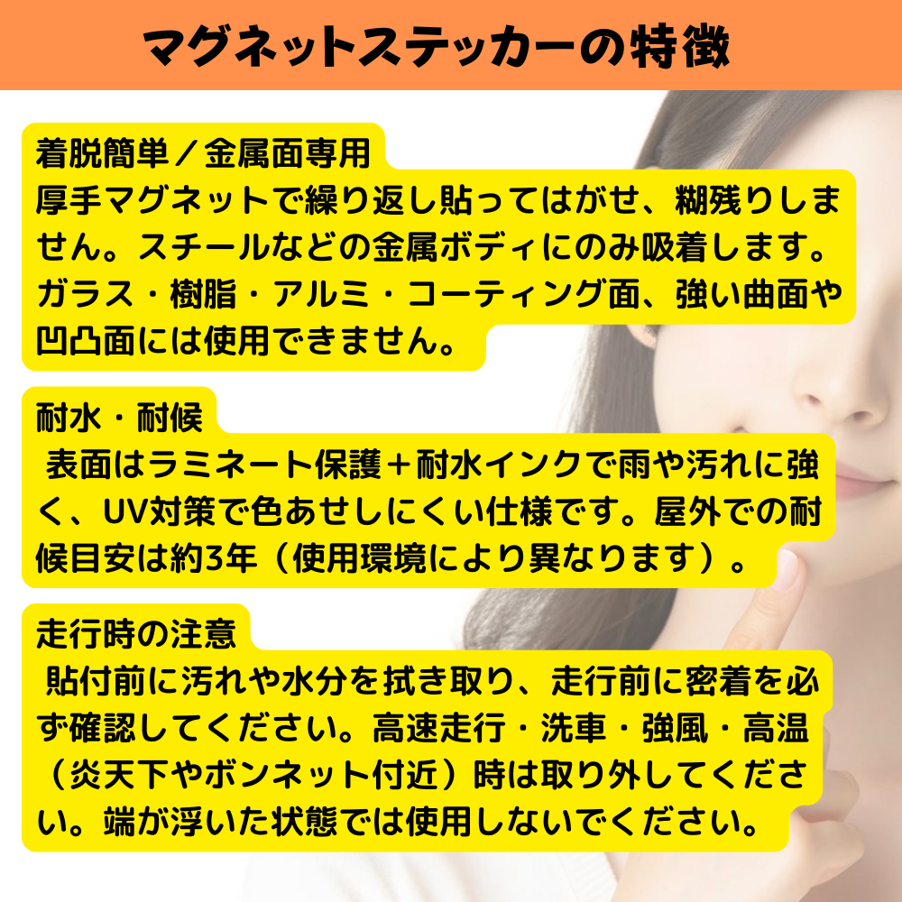 【 強力磁力&防水・耐候仕様でしっかり固定 】:強い磁力で金属部分にしっかり密着し、走行中の風圧にも安心。防水・耐候加工により、雨や日差しに強く長期間使用できます。貼り直し・取り外しも簡単で、必要な時だけ使える便利なセーフティサインです。