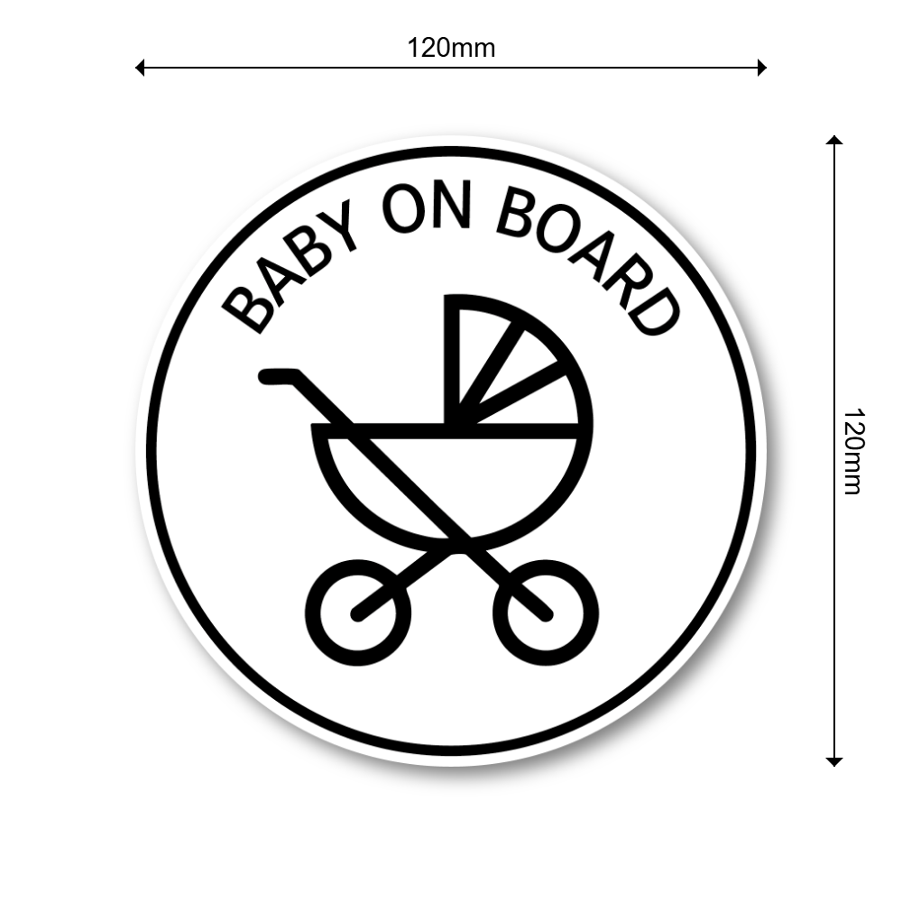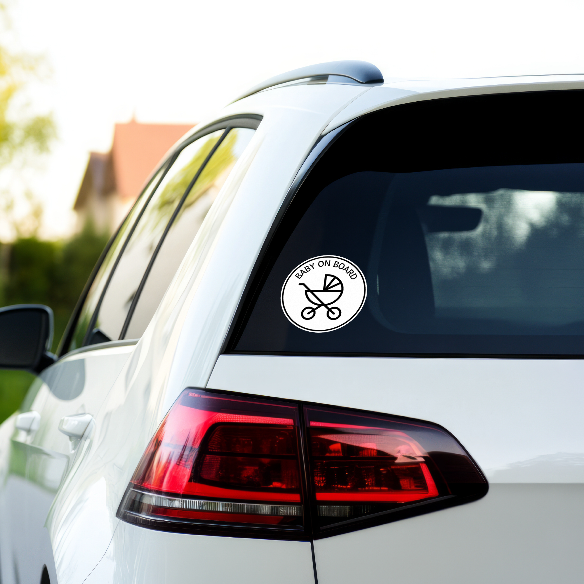 視認性とデザイン性を兼ね備えたBABY ON BOARDサイン:シンプルでクールなベビーカーアイコンを配置した丸形デザインの「BABY ON BOARD」ステッカーです。ブラック・ホワイト・イエローの3カラー展開で、車体色や好みに合わせて選べます。高コントラストで視認性が高く、後続車へ存在を分かりやすく知らせ、安全運転を促す効果が期待できます。ミニマルで洗練されたデザインはどんな車にもマッチします。