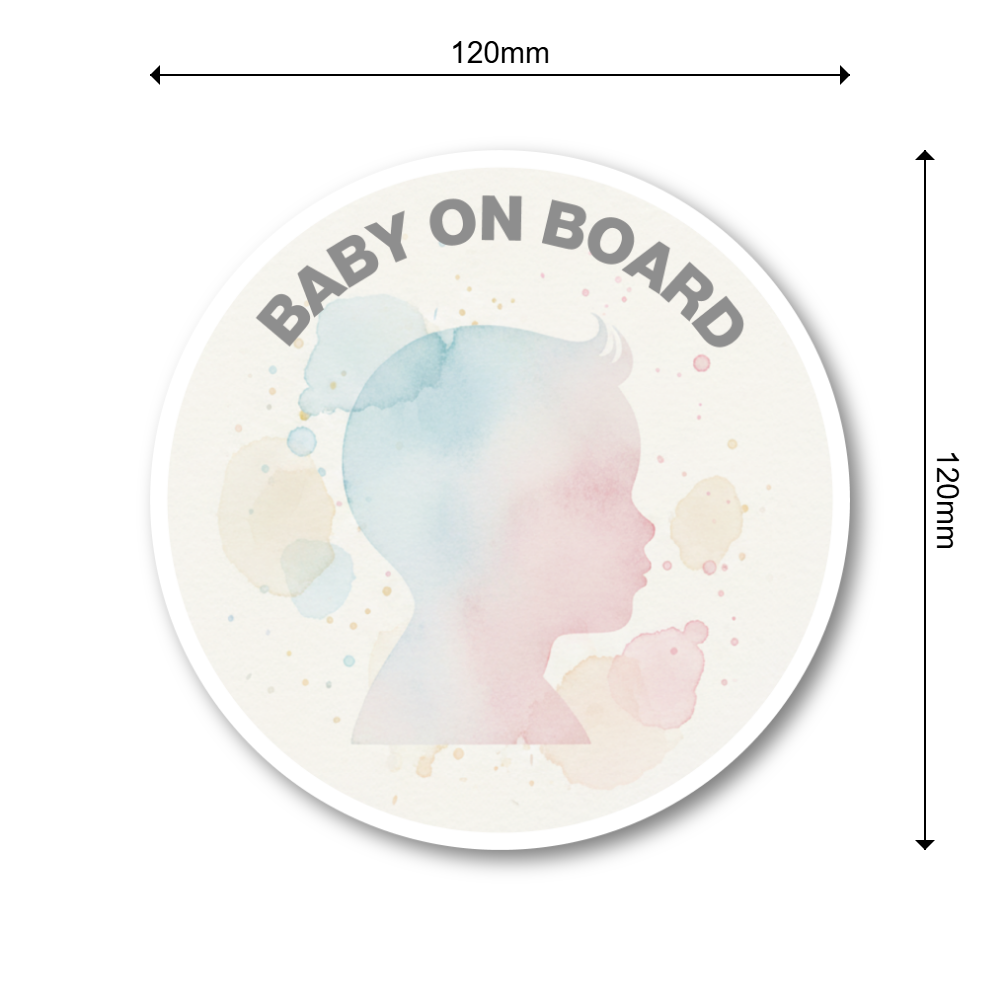 💡 水彩アートの上品デザインで大人の車にも馴染む BABY ON BOARD:柔らかな水彩タッチで描いた赤ちゃんのシルエットが特徴の、上品で落ち着いた「BABY ON BOARD」ステッカーです。ニュートラルな淡色ベースのため、白・黒・ネイビー・シルバーなど、どんな車体色にも自然に馴染みます。子どもっぽさを抑えつつも優しさのあるデザインで、はじめての育児世帯や大人向けの洗練されたステッカーを求める方に最適です。