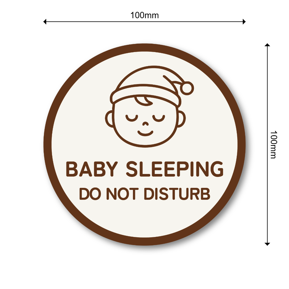 【赤ちゃんのお昼寝を静かに守る100mm玄関ステッカー】:「BABY SLEEPING」「DO NOT DISTURB」と分かりやすく伝える玄関ドア用ステッカーです。配達員や来客へのノック・チャイムを控えてほしい気持ちを丁寧に案内し、お昼寝中の赤ちゃんを音から守ります。防水・耐候仕様で屋外の玄関ドアにも安心して使用できます。
