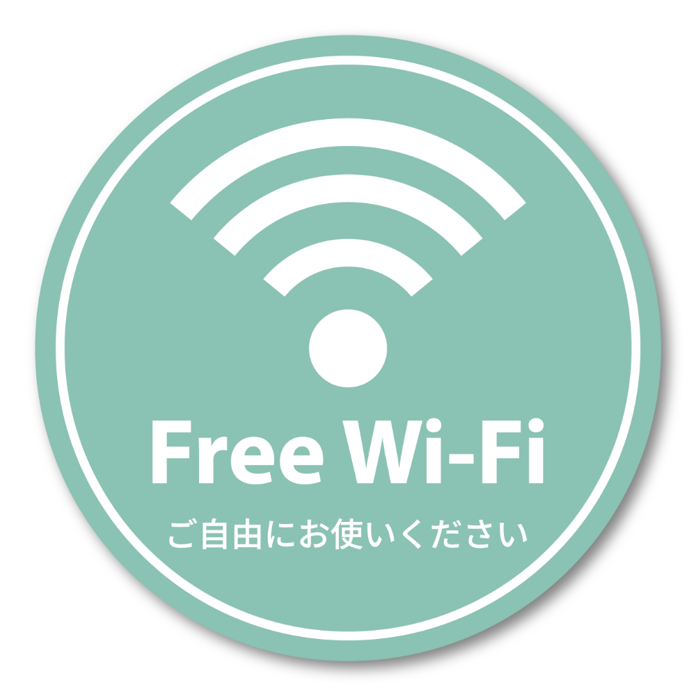 店内のFree Wi-Fiをひと目でわかりやすく案内:「Free Wi-Fi」「ご自由にお使いください」と英語+日本語で表示した、丸形100mmのWi-Fi案内ステッカーです。シンプルなアイコンと読みやすい文字で、入口ドアや窓ガラス、レジ横、受付カウンターなどに貼るだけで、店内に無料Wi-Fiがあることをお客様にわかりやすく伝えられます。直径100mmのほどよいサイズ感で、離れた場所からでも視認しやすく、インテリアの雰囲気も邪魔しません。