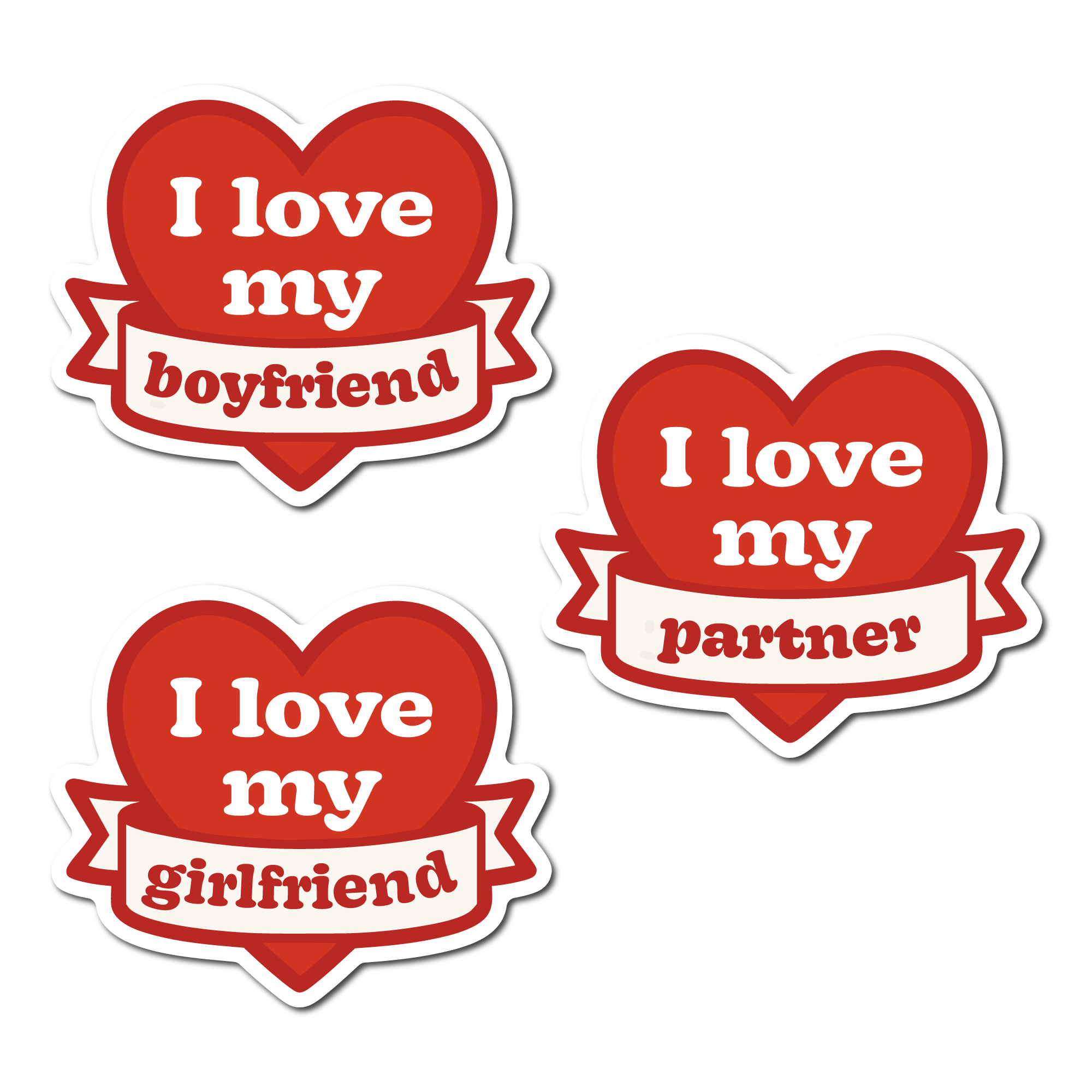 使いやすいサイズ&映えるデザイン:赤いハートに「I love my ______」のメッセージを載せた王道デザイン。3インチ(約76mm)の貼りやすいサイズで、ノートPC・水筒・スーツケース・タブレットなどにちょうど良く、写真映えも抜群。girlfriend / boyfriend / partner 各1枚ずつの3枚セットだから自分用+プレゼント用にも。