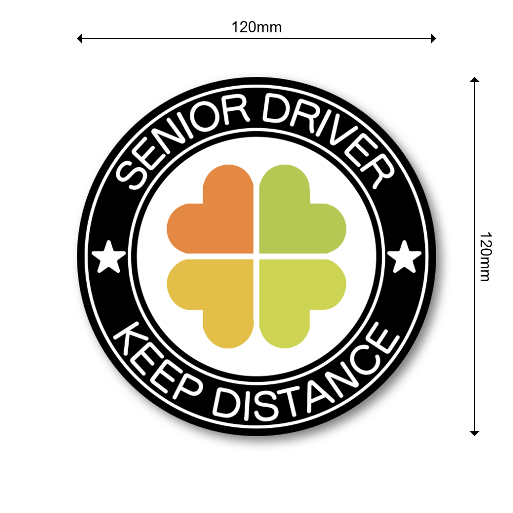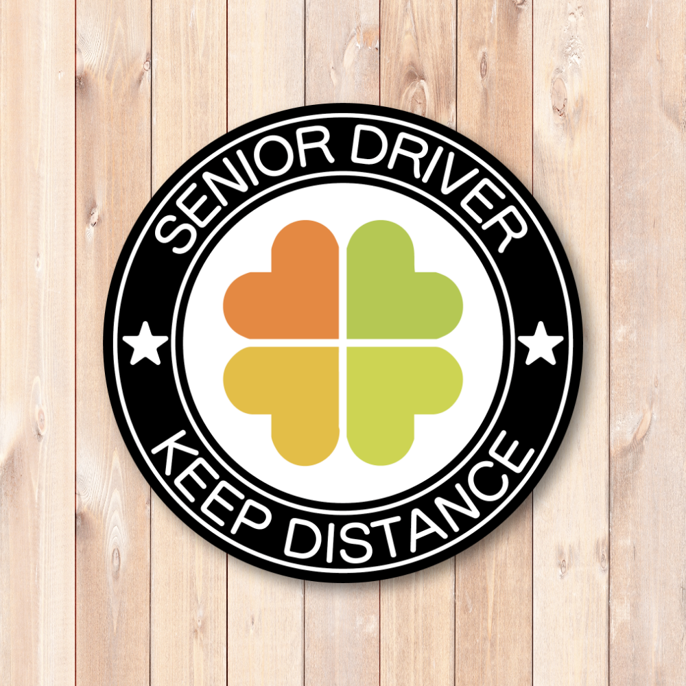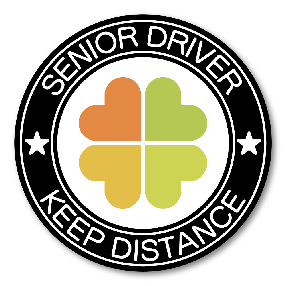 ■ 英語で「車間距離をあけて」を伝えるシニアドライバー用ステッカー:外周に「SENIOR DRIVER」「KEEP DISTANCE」のメッセージを大きく配置した、シニアドライバー向けの丸型ステッカーです。黒ベースに白文字のはっきりしたデザインで、後続車に「高齢ドライバーが運転しています」「車間距離をとってください」というメッセージをシンプルに伝えることができます。中央には四つ葉のようなモチーフを採用し、ソフトなオレンジ&イエロー系のクローバー風デザインと、赤・黄・グリーン系のカラフルなデザインの2種類をバリエーションとして選べます。