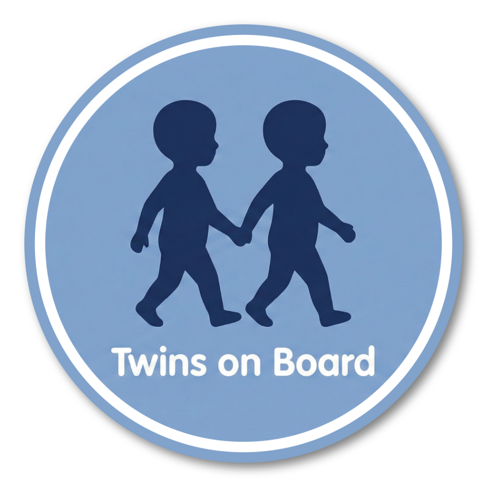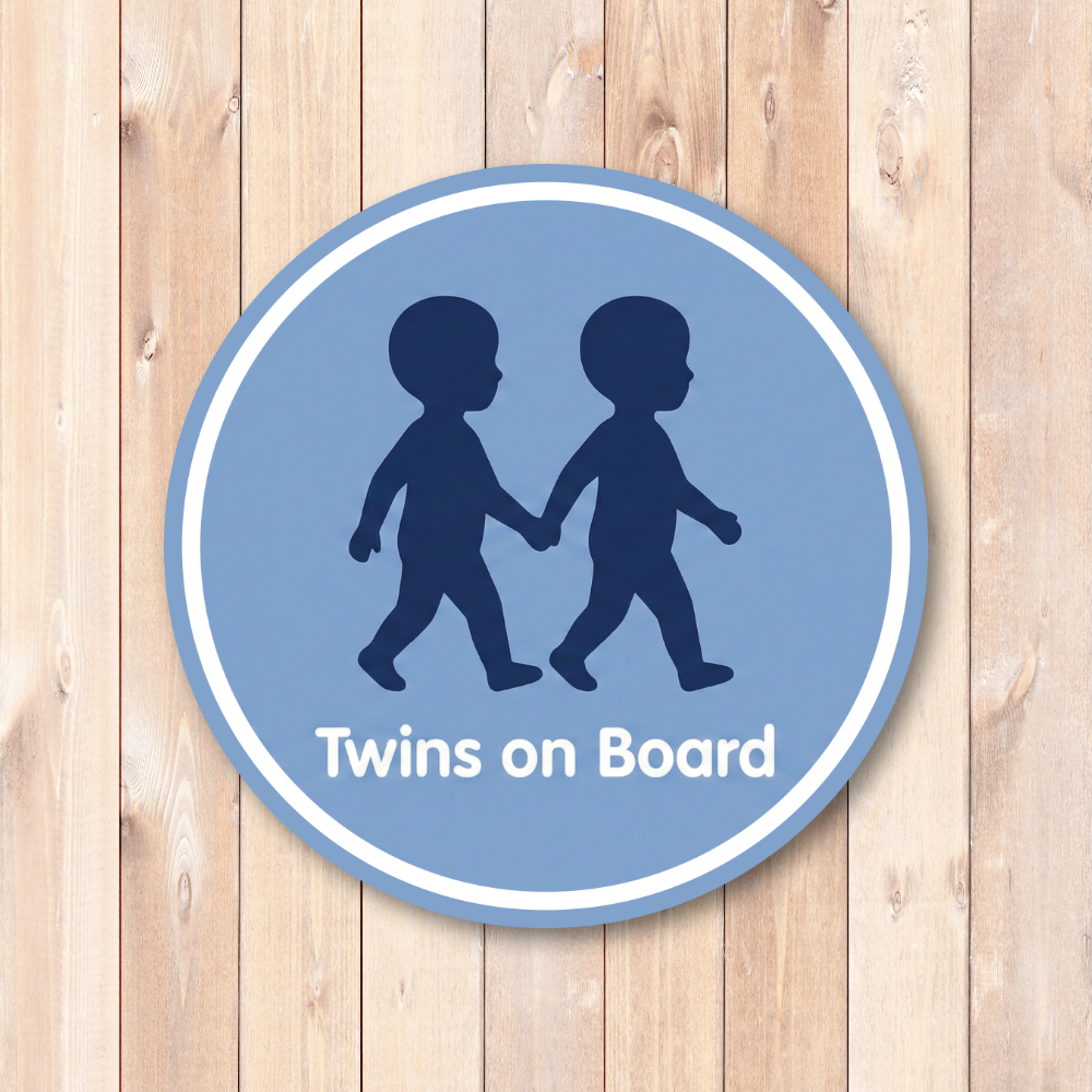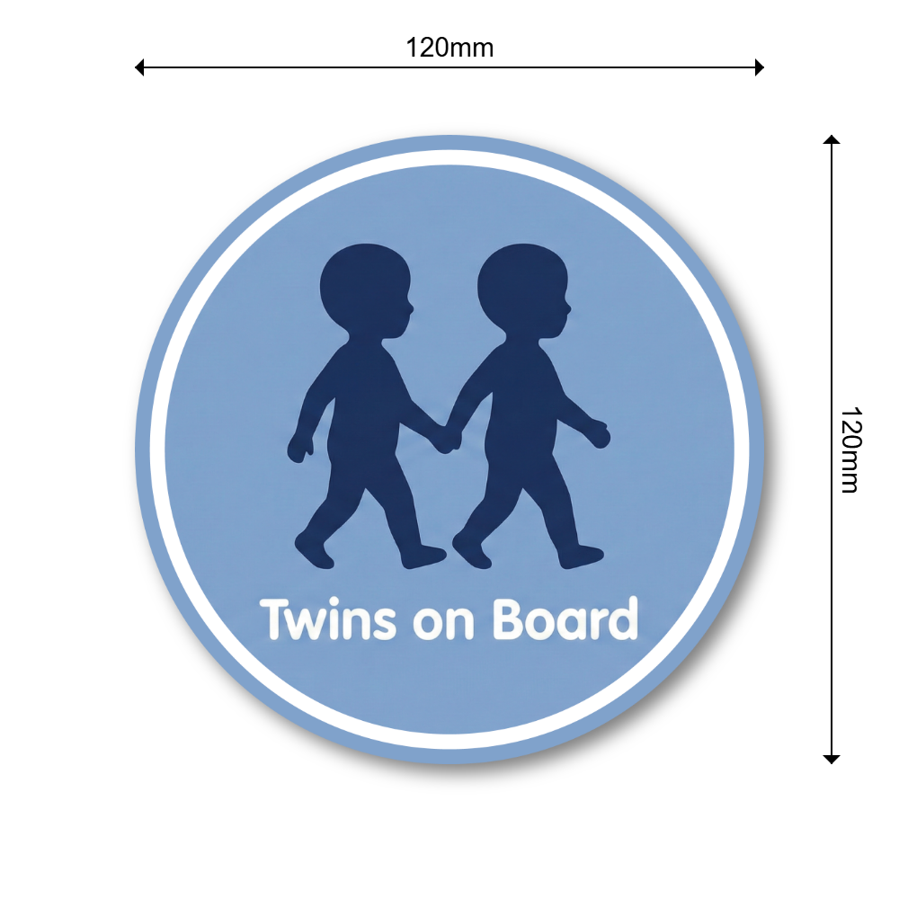 【シンプルなシルエットのTwins on Boardサイン】:手をつないで歩く双子の子どもをモチーフにした、丸型「Twins on Board」ステッカーです。落ち着いたブルーの背景にネイビーのシルエットと白文字ロゴを組み合わせた、すっきりとしたデザインがポイント。直径約120mmの見やすいサイズで、双子が乗っていることをさりげなく伝えつつ、車の雰囲気を損なわないシンプルなカーステッカーです。ファミリーカーやミニバン、SUVなど、どんなボディカラーにも合わせやすいカラーリングに仕上げています。