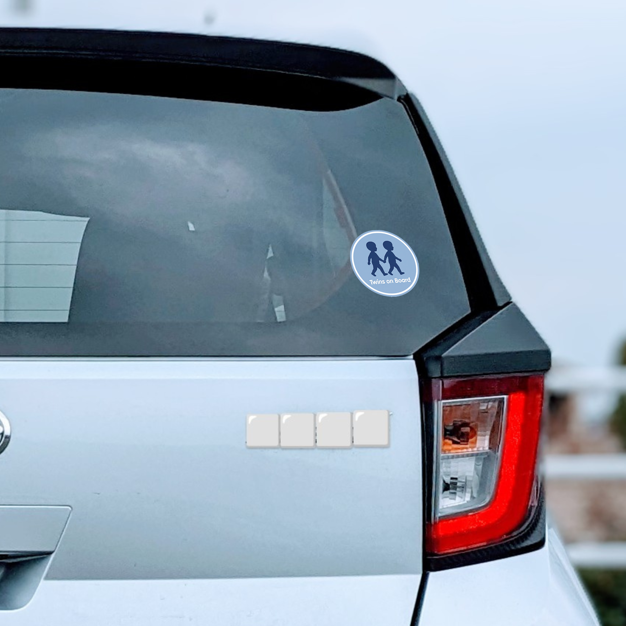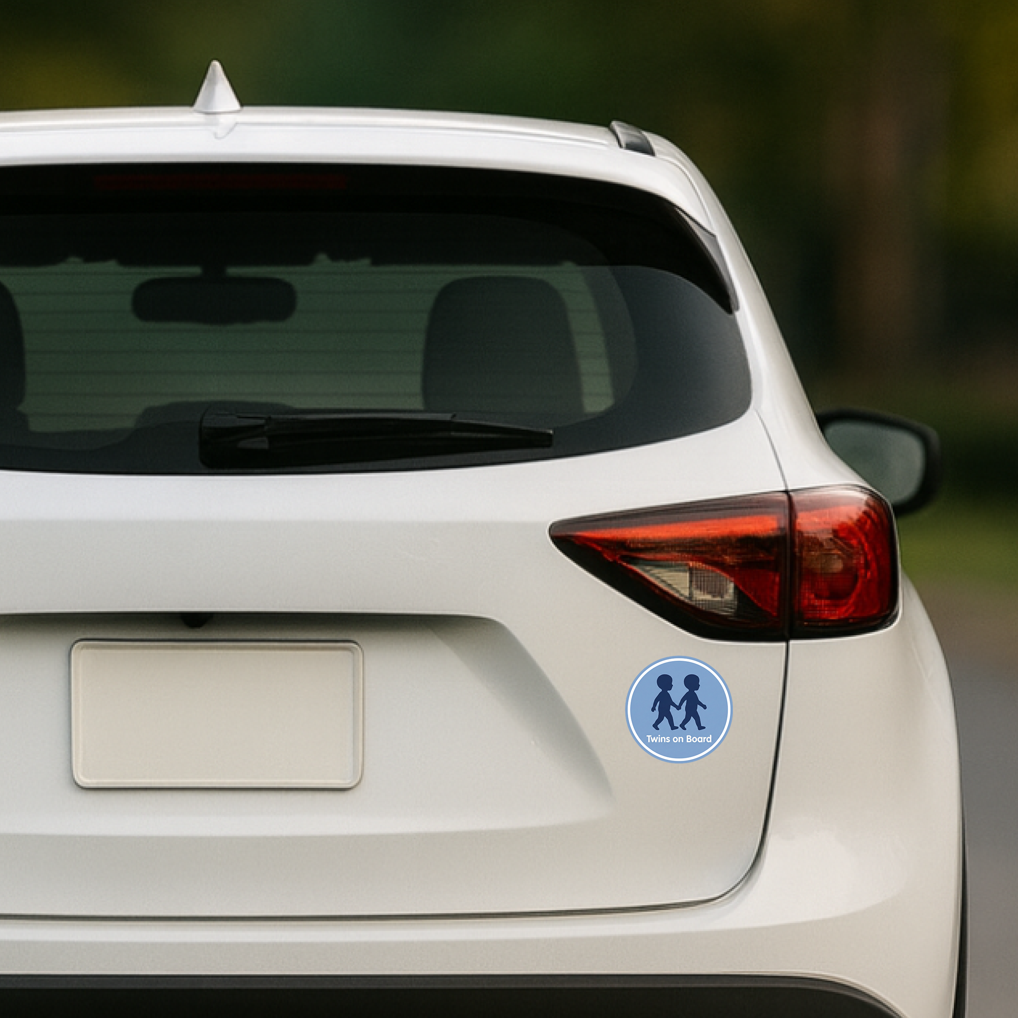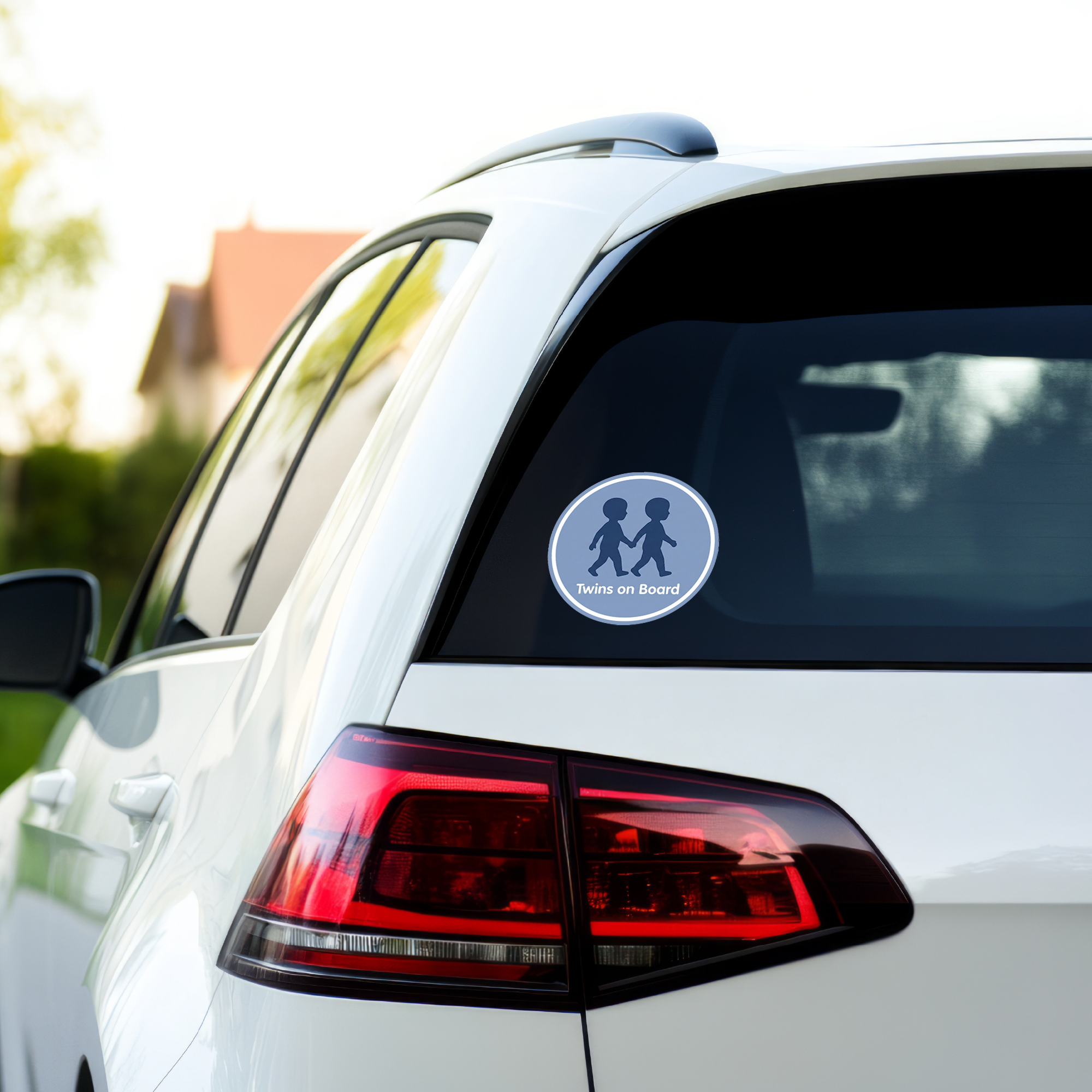 【シンプルなシルエットのTwins on Boardサイン】:手をつないで歩く双子の子どもをモチーフにした、丸型「Twins on Board」ステッカーです。落ち着いたブルーの背景にネイビーのシルエットと白文字ロゴを組み合わせた、すっきりとしたデザインがポイント。直径約120mmの見やすいサイズで、双子が乗っていることをさりげなく伝えつつ、車の雰囲気を損なわないシンプルなカーステッカーです。ファミリーカーやミニバン、SUVなど、どんなボディカラーにも合わせやすいカラーリングに仕上げています。