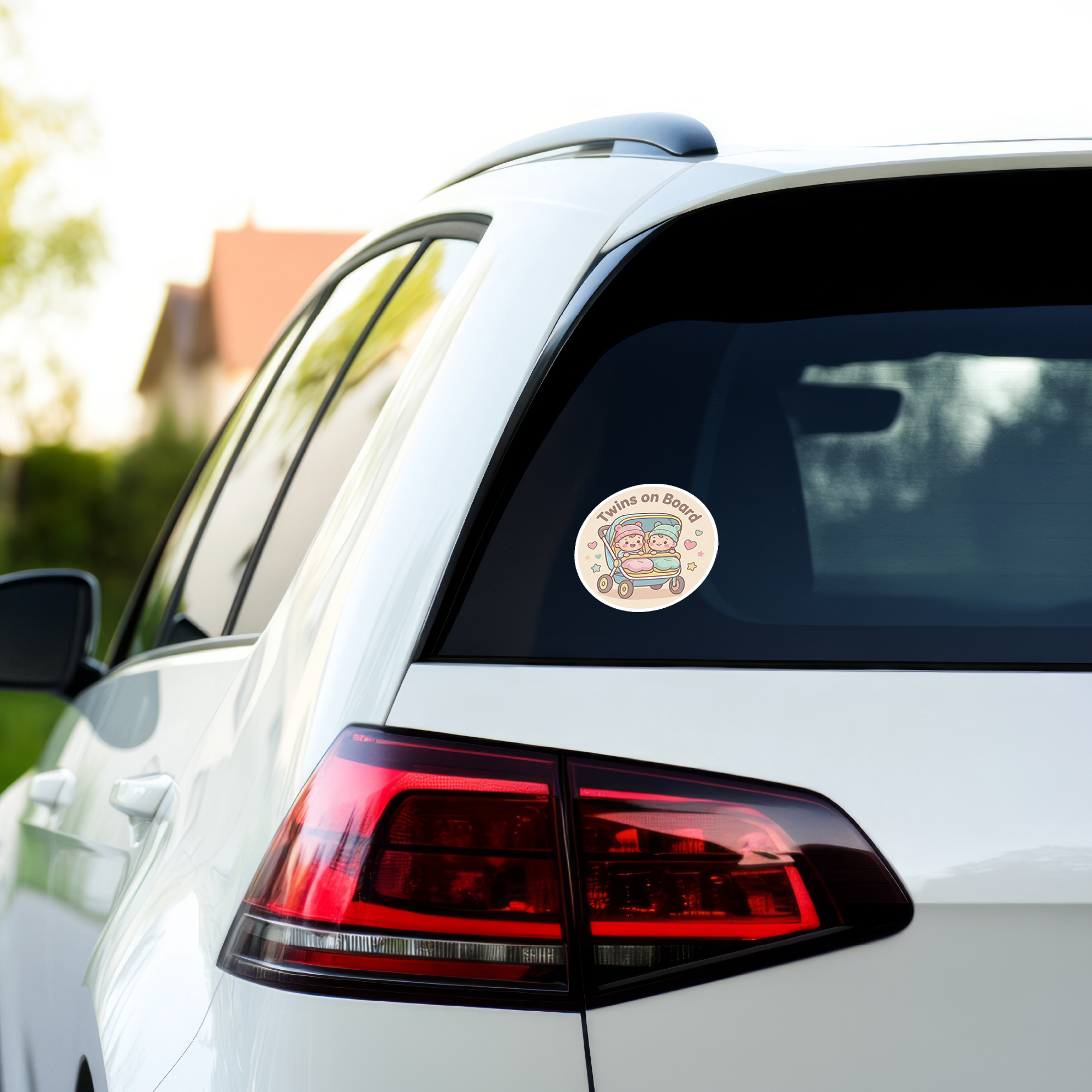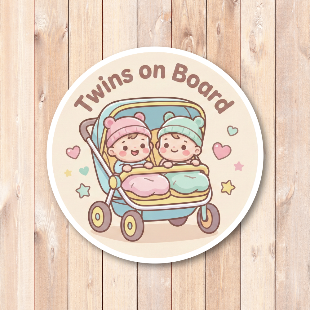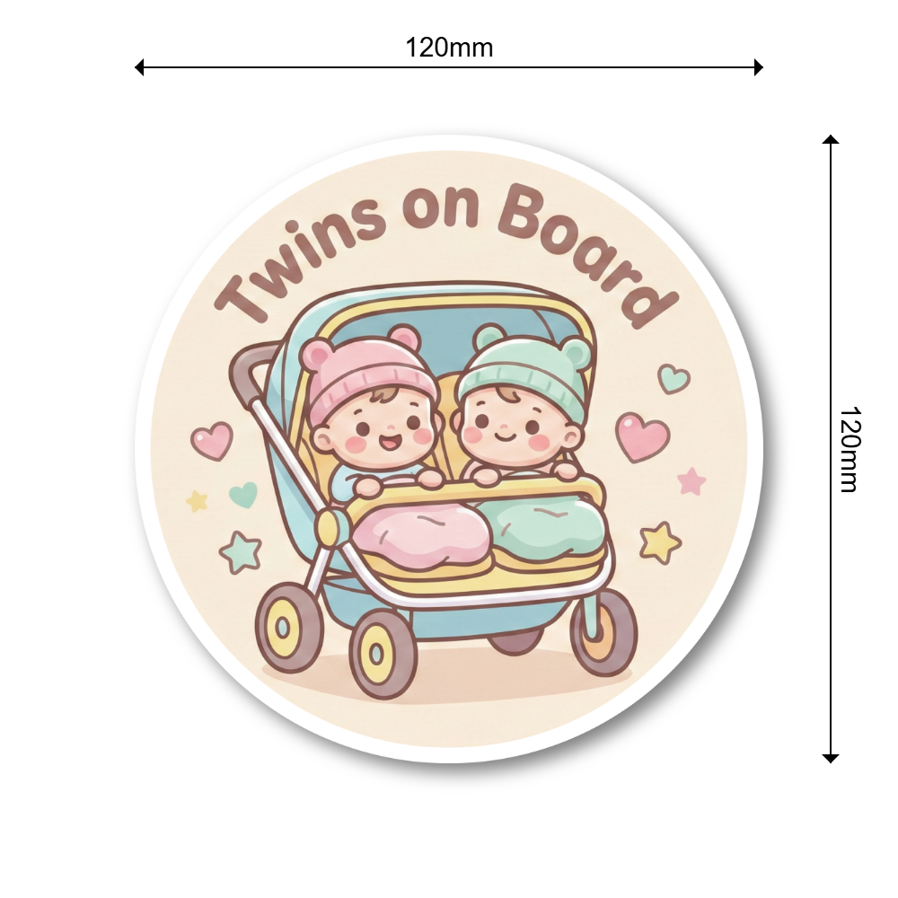 【双子用ベビーカーのかわいいTwins on Boardデザイン】:並んで座った双子の赤ちゃんがベビーカーに乗ってにっこり笑う、丸型「Twins on Board」ステッカーです。やさしいクリームカラーの背景に、ピンクとミントの帽子やブランケット、まわりに散りばめられたハートや星が映えるパステルデザイン。直径約120mmの見やすいサイズで、双子ママ・双子パパの車にぴったりのツインズサインです。英語ロゴ「Twins on Board」がはっきり読めるので、後続車にも双子が乗っていることをさりげなく伝えられます。